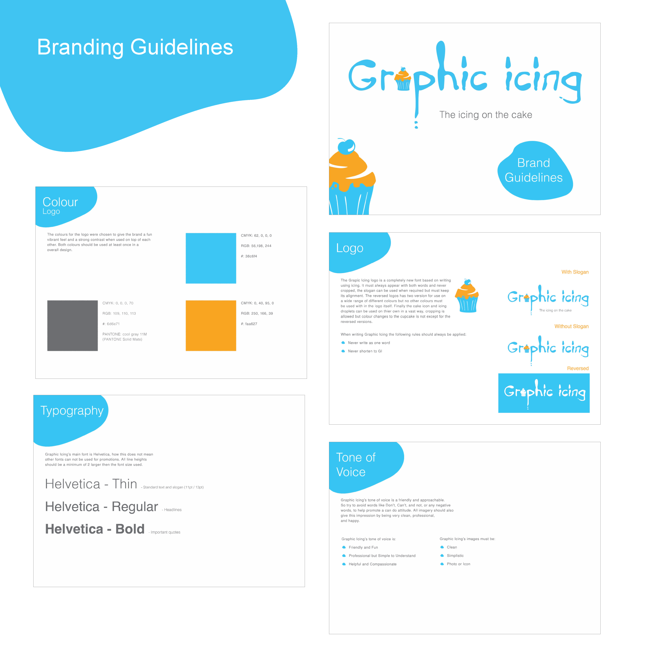 The name and concept came from a simple metaphor: branding is like icing on cakes. Just as icing gives identical cakes their unique look, a strong visual identity helps businesses differentiate themselves and connect with their audience. This idea shaped the design process of this project, from early logo sketches inspired by piped icing through to the final brand. The result was a colourful and versatile identity that reinforced the business’s mission to make design easy to understand and accessible for every client.