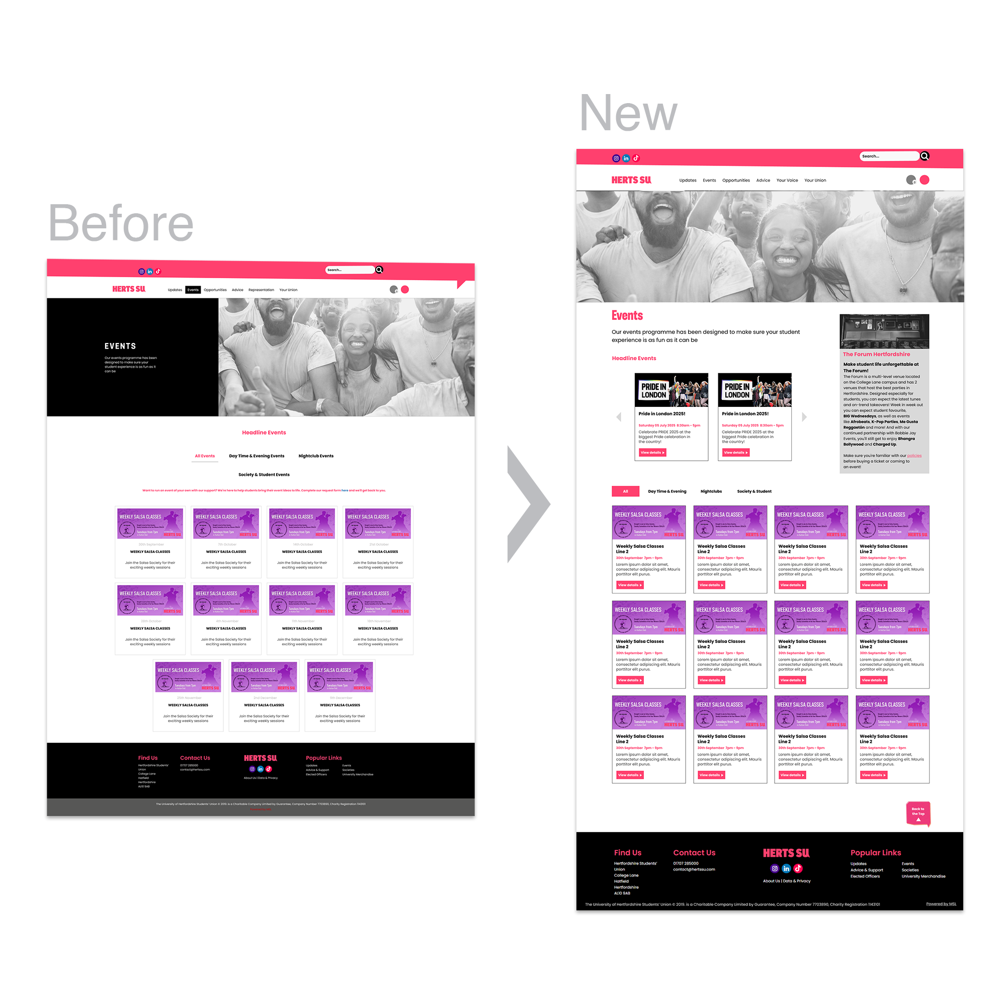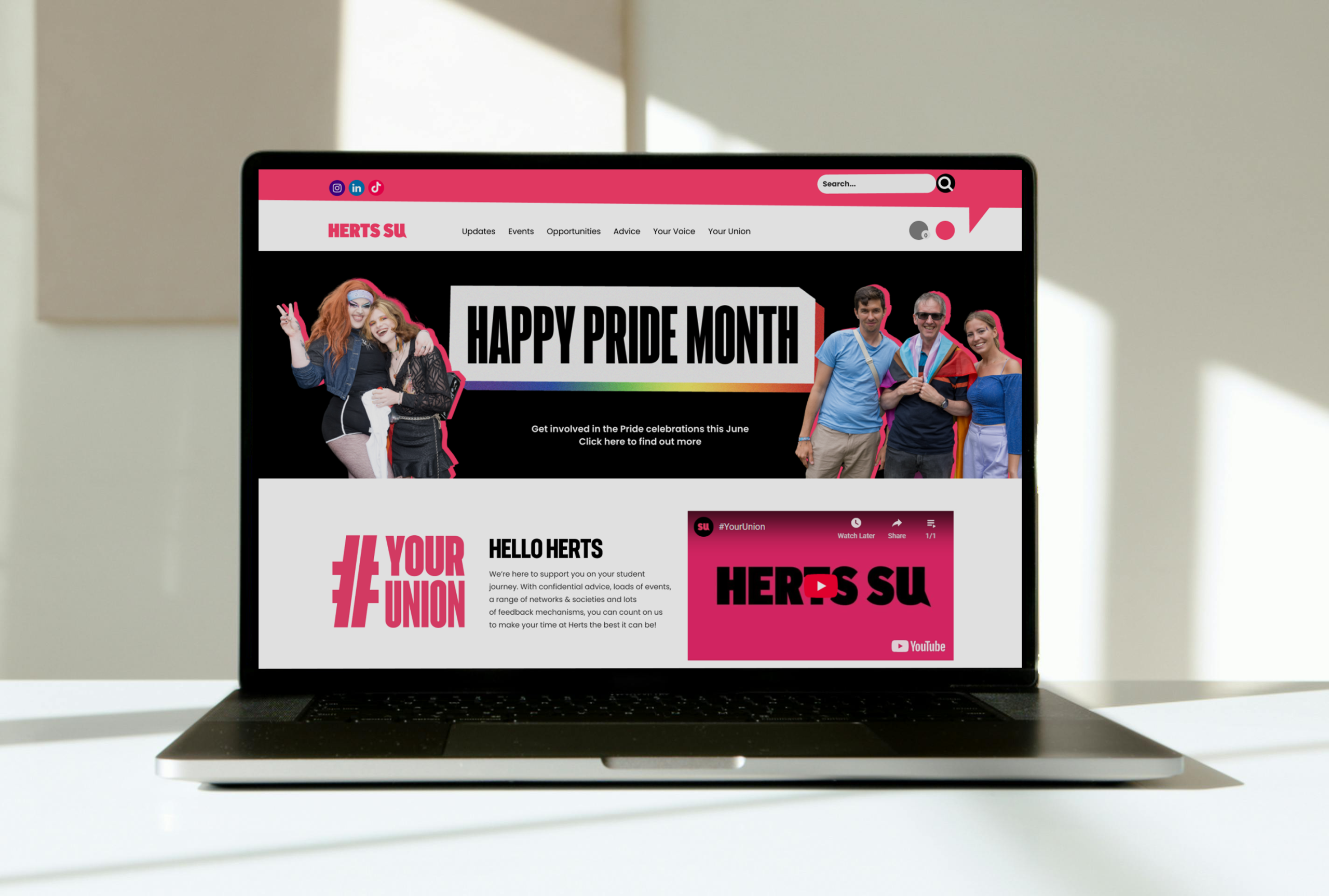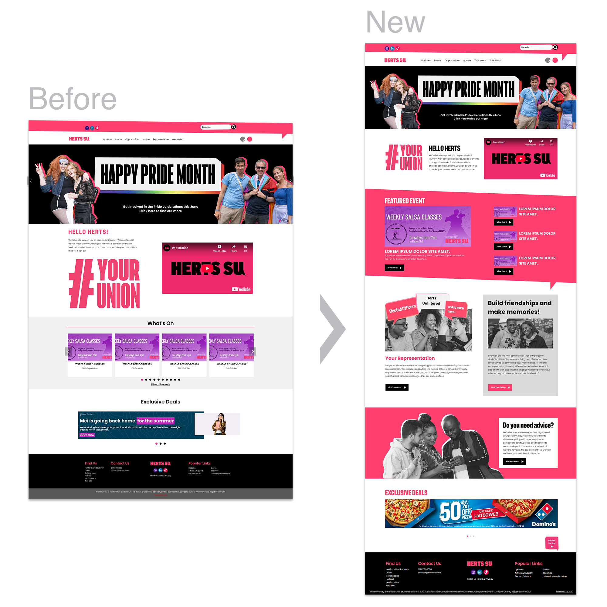 The Hertfordshire Students’ Union asked me to redesign their neglected website, which had outdated content and inconsistent branding. My role was to work with the full marketing team to restructure the site, design new layouts in Figma, and refine visuals with the in-house designer. Once approved, I implemented the build within their MSL content management system, combining coded components with editable templates so staff across the Union could manage updates.