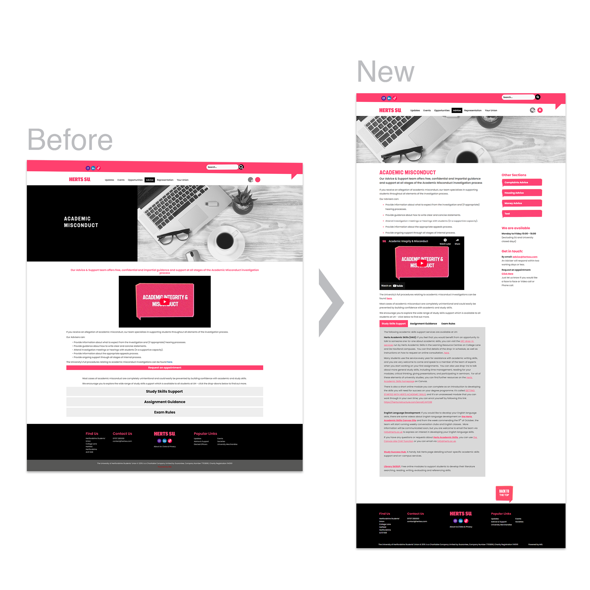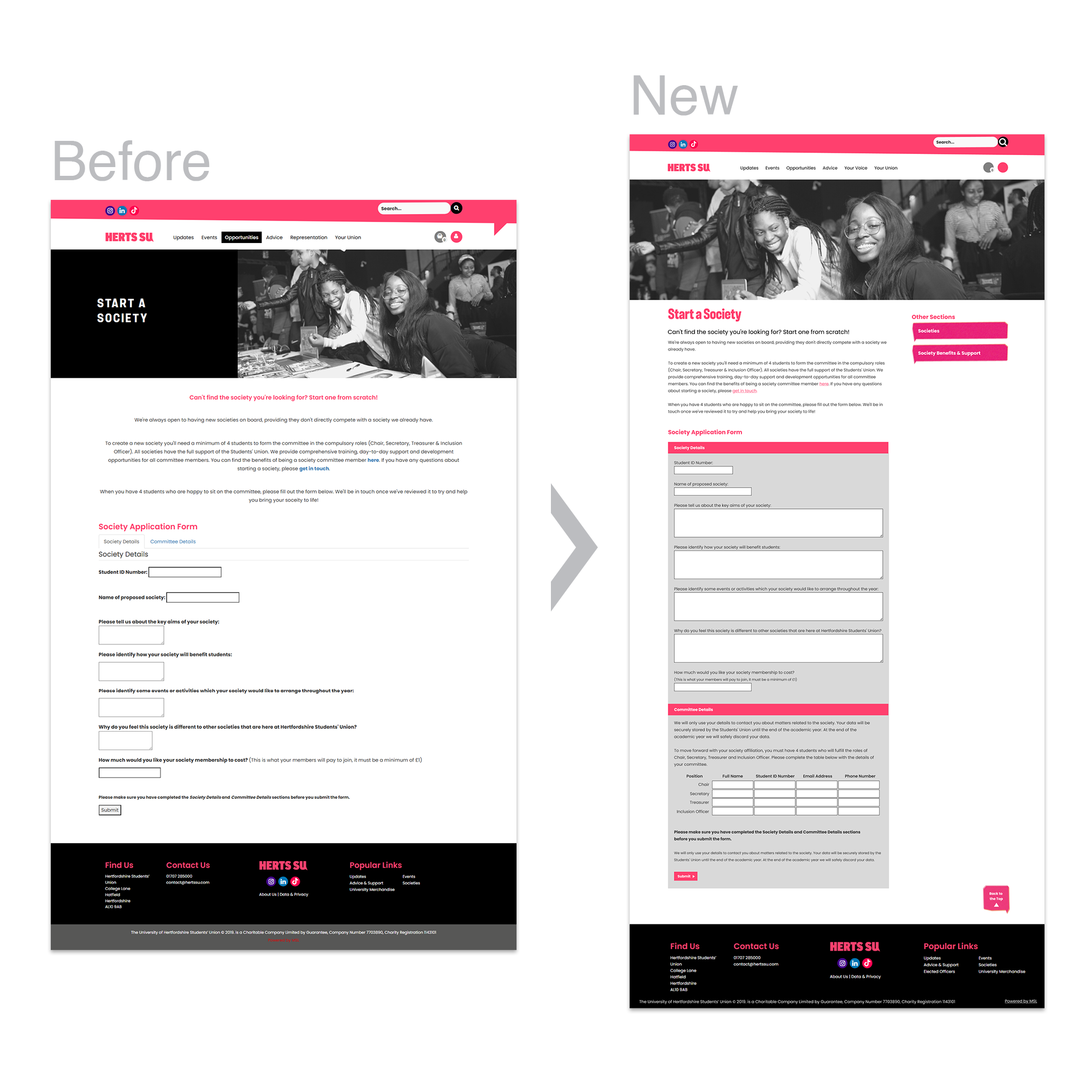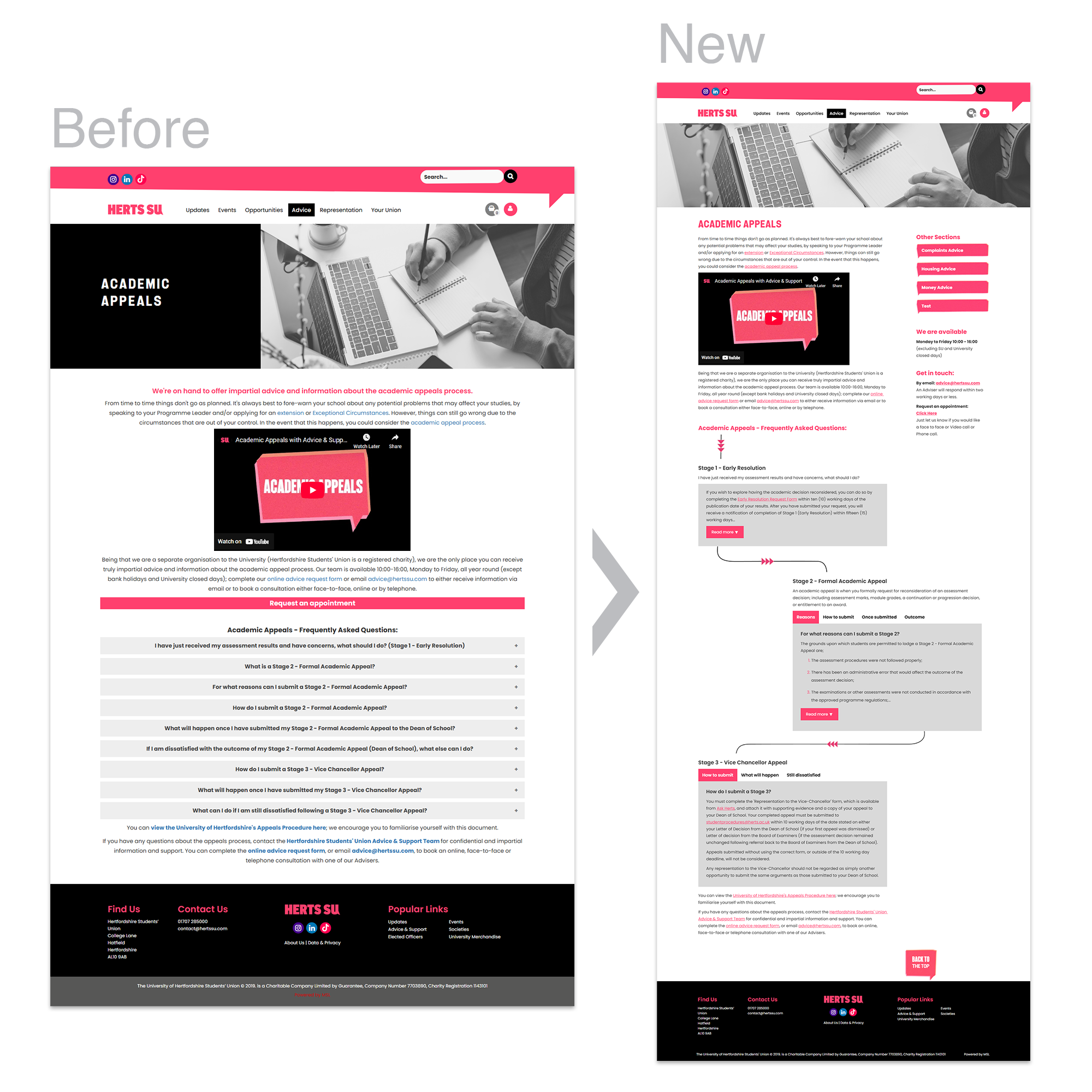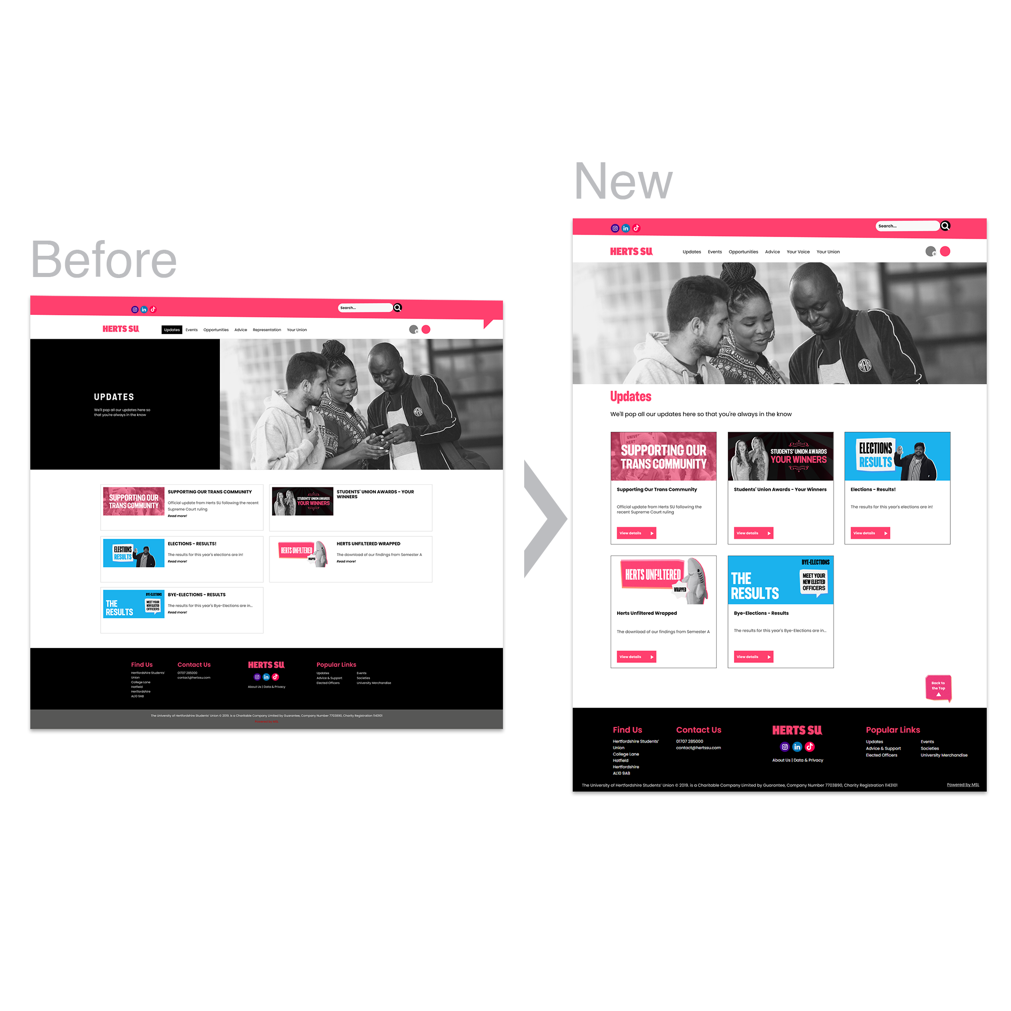 The Hertfordshire Students’ Union asked me to redesign their neglected website, which had outdated content and inconsistent branding. My role was to work with the full marketing team to restructure the site, design new layouts in Figma, and refine visuals with the in-house designer. Once approved, I implemented the build within their MSL content management system, combining coded components with editable templates so staff across the Union could manage updates.